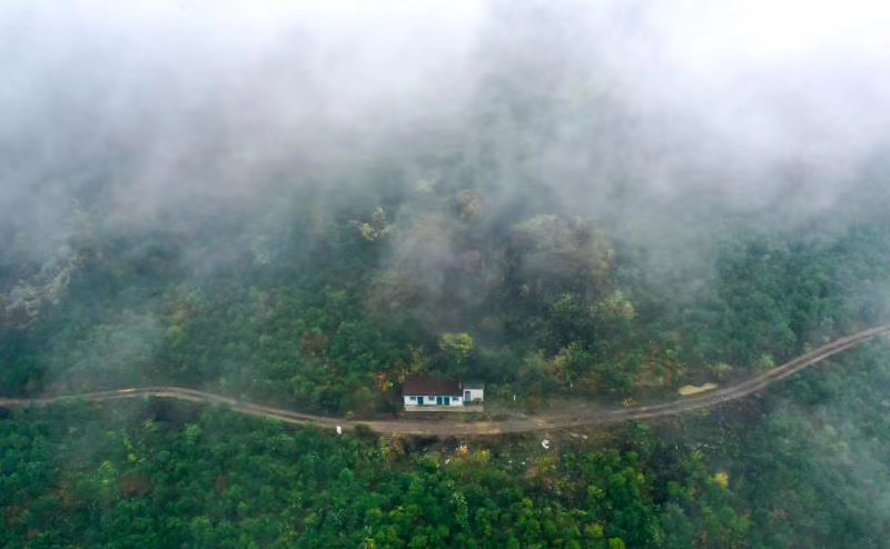 路若盤龍環戲水,雨灑叢林濕落花。